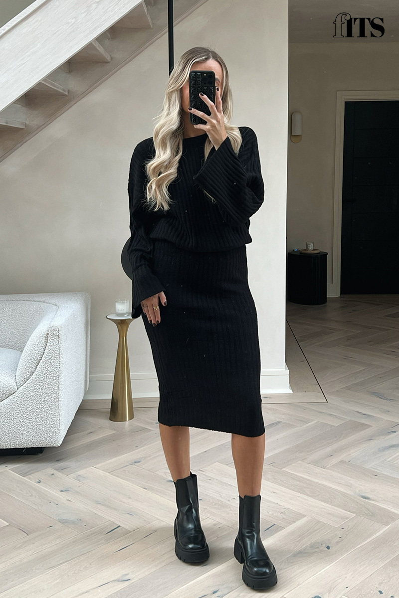 We are loving this skirt featuring a black knitted material and midaxi length, pair with the matching jumper for a look we love.
